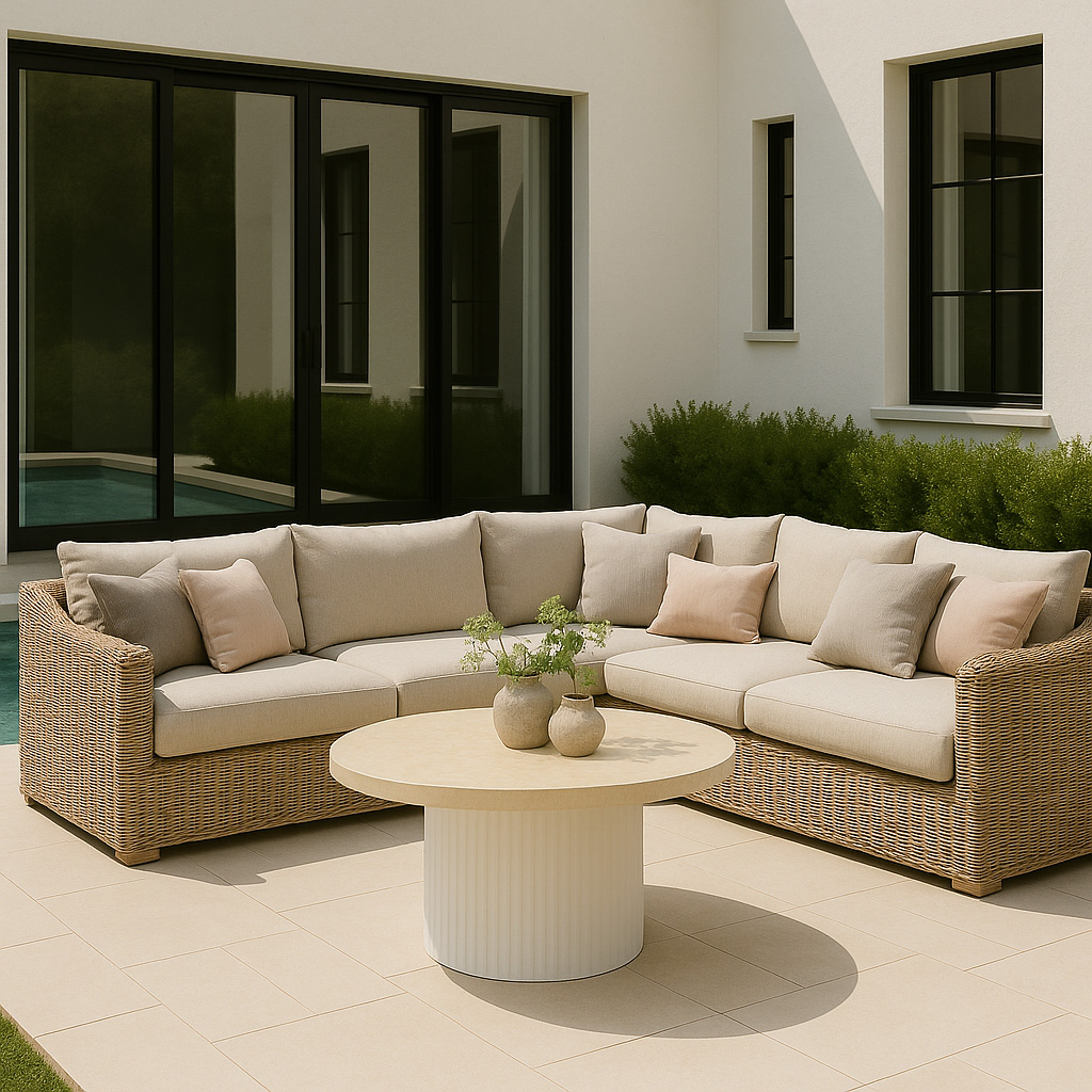 Detta balkongset passar bra för mindre uteplatser eller balkonger där en stilren och funktionell möbel önskas. Bordet från Merca-serien har en rund bordsskiva i fiberbetong med travertinprint som ger ett naturligt uttryck och en slitstark yta anpassad för utomhusbruk. För att behålla finishen rekommenderas skydd vid kraftigt regn och vinterförvaring.