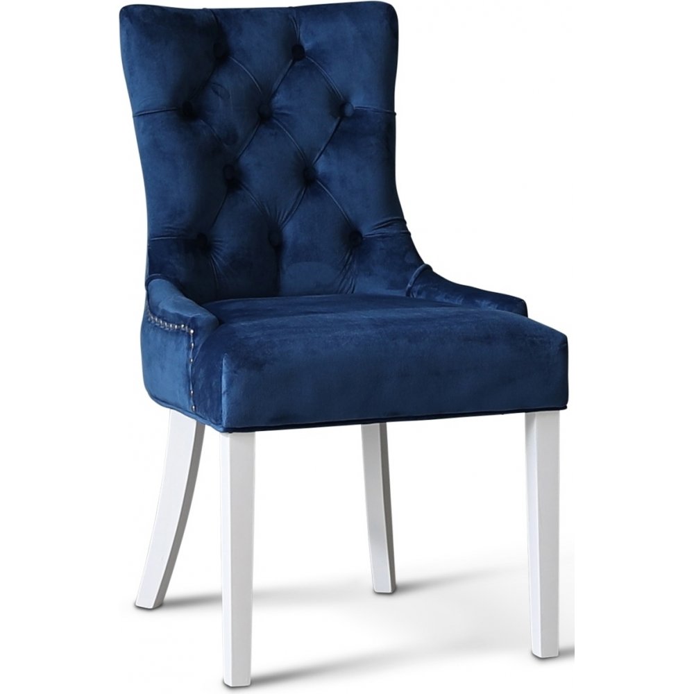 Dalsland matgrupp med stort och bra matbord med toppskiva i oljad ek och vitlackat underrede. 6 st sköna Tuva Decutique stolar i blå sammet med vita ben.