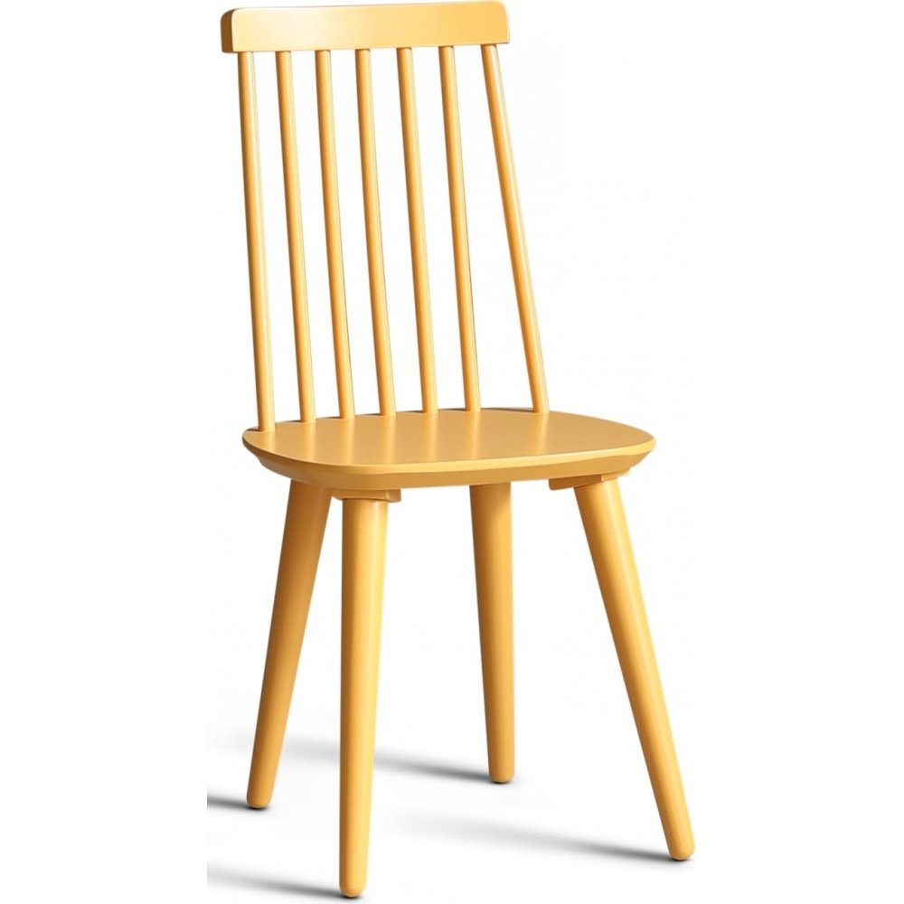 Dalsland matgrupp med runt matbord med toppskiva i oljad ek och vitlackat underrede. Dalsland pinnstolar i en läcker gul lack (RAL1032)