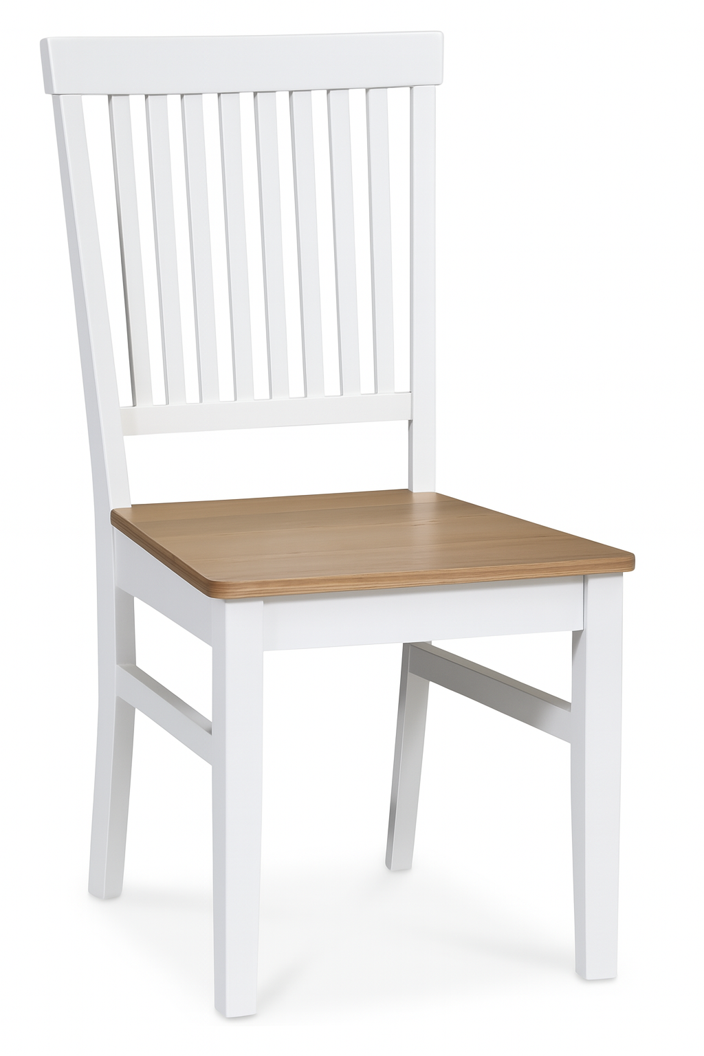 Klassiskt matgrupp, bord med underrede och toppskiva av massivt vitlackat trä. Modern stol i massivt heveaträ, sits i fanerad ek.