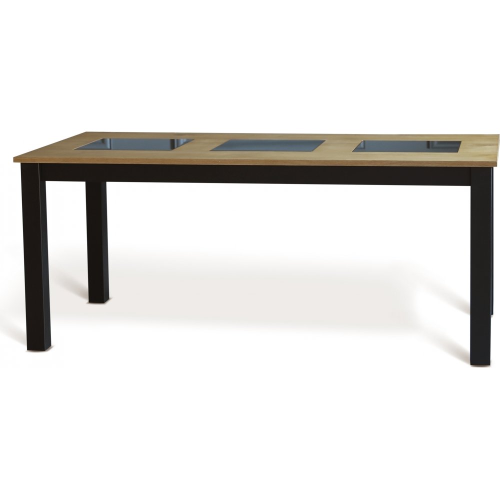 Matgrupp med matbord och 6 st stolar ur serien Texas och Granit. Matbordet är gjort ek och fanèrad ek med svarta glasplattor. Stolarna är gjorda av metall med klädsel av konstläder(PU).