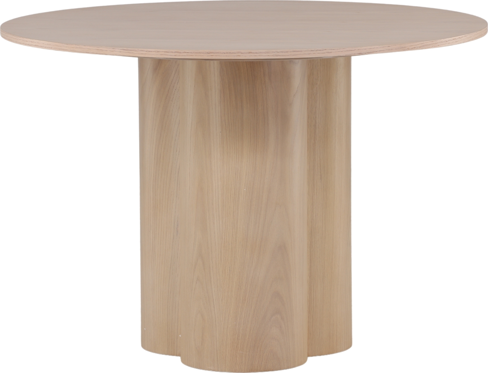 Matbord med skandinavisk design och smakfull utformning. Bordet har en genomgående helhetsdesign i vitputsad MDF med en tunn, rund toppskiva och tre cylinderformade ben som sitter samlat under bordets mitt. Det tunna färglagret synliggör materialets mönster och ger liv och rörelse till bordet. Skapa ett stilrent blickfång i hemmets hjärta där hamnar ingen på kanten.