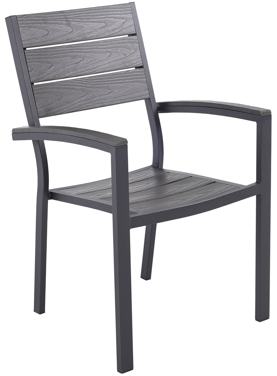 Stolarna är karmstolar med bekväma armstöd och grå detaljer i noonwood som ger en modern och naturlig känsla. Aluminiumstommen är svartlackad för att klara utomhusbruk året runt, och materialen är valda för att vara enkla att rengöra och underhålla. Den här matgruppen passar dig som vill ha en robust och snygg utemöbel med lång livslängd.