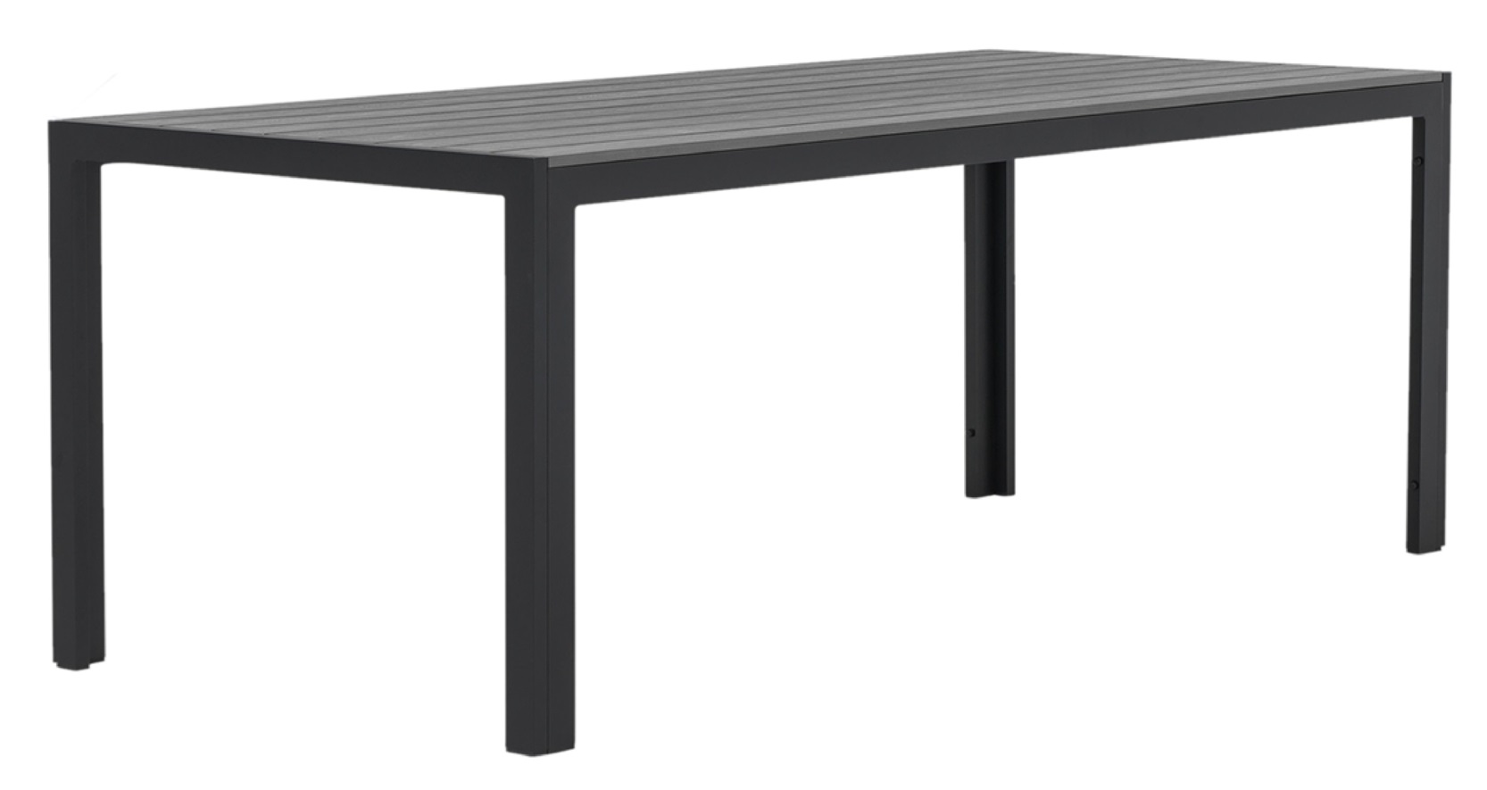 Denna matgrupp i svart och grått kombinerar slitstarka och vädertåliga material med en stilren design som passar utmärkt på altanen eller uteplatsen. Bordet har en tålig bordsskiva i grå aintwood som tål alla slags väder och en stabil stomme i svartlackad aluminium, vilket gör bordet lättskött och hållbart.