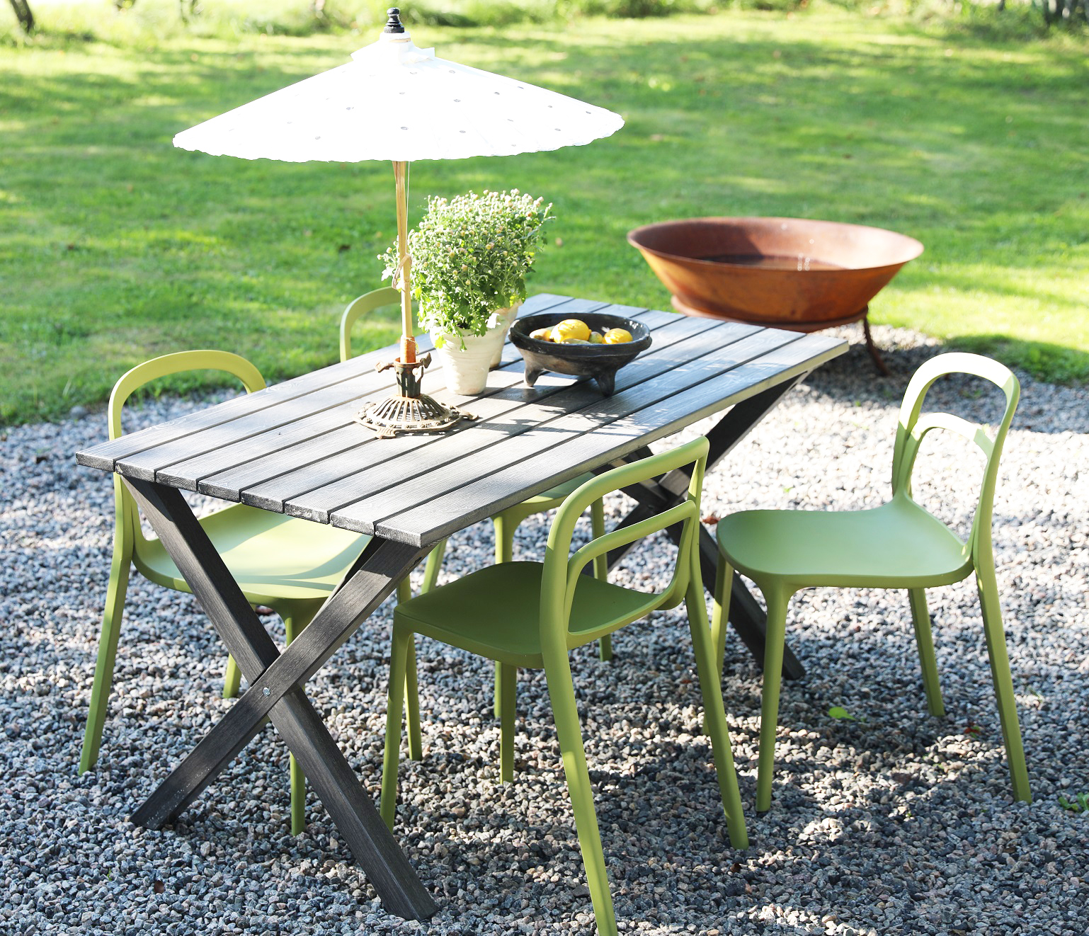 En nätt matgrupp till uteplatsen från Skånska Möbelhuset. Holmö runt matbord Ø103 cm i diameter med vitlackat underrede och vit aintwood toppskiva. Till matgruppen medföljer 4 st stapelbara Nordanå stolar i grön formgjuten plast. En matgrupp i harmoni där möblerna går snyggt ihop och skapar en helhet som är svåröverträffad. Passar lika bra i uterummet som på altanen.