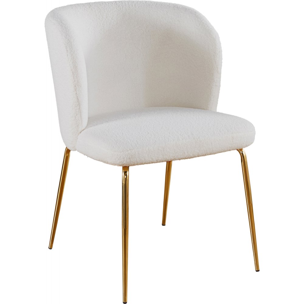Stolarna i bouclé kompletterar bordet med sin mjuka, texturerade klädsel i creamfärgat tyg och eleganta ben i mässingsfinish. Kombinationen av boucléns taktila känsla och mässingens glans skapar en lyxig men inbjudande atmosfär. Stolarna erbjuder dessutom hög sittkomfort tack vare sin generösa stoppning och omslutande form.