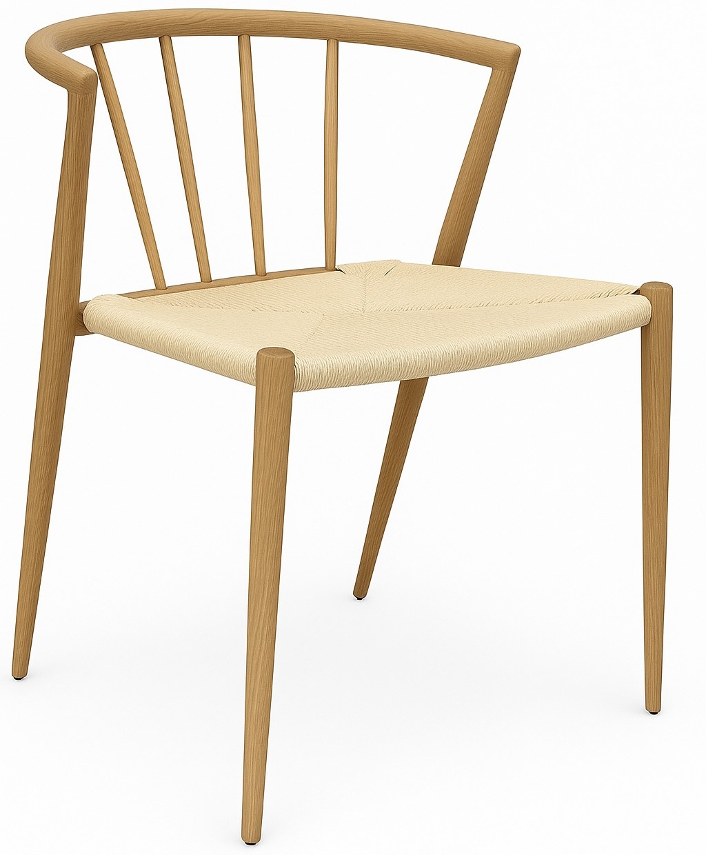 Stolarna i gruppen har en lätt och stilren design med ekfolierad stomme och sits i beige rep. Formen påminner om klassiska inomhusstolar vilket ger en hemtrevlig känsla till uteserveringen eller altanen. Den rejäla sitsen och den genomtänkta höjden gör stolen både bekväm och lättplacerad i olika miljöer.