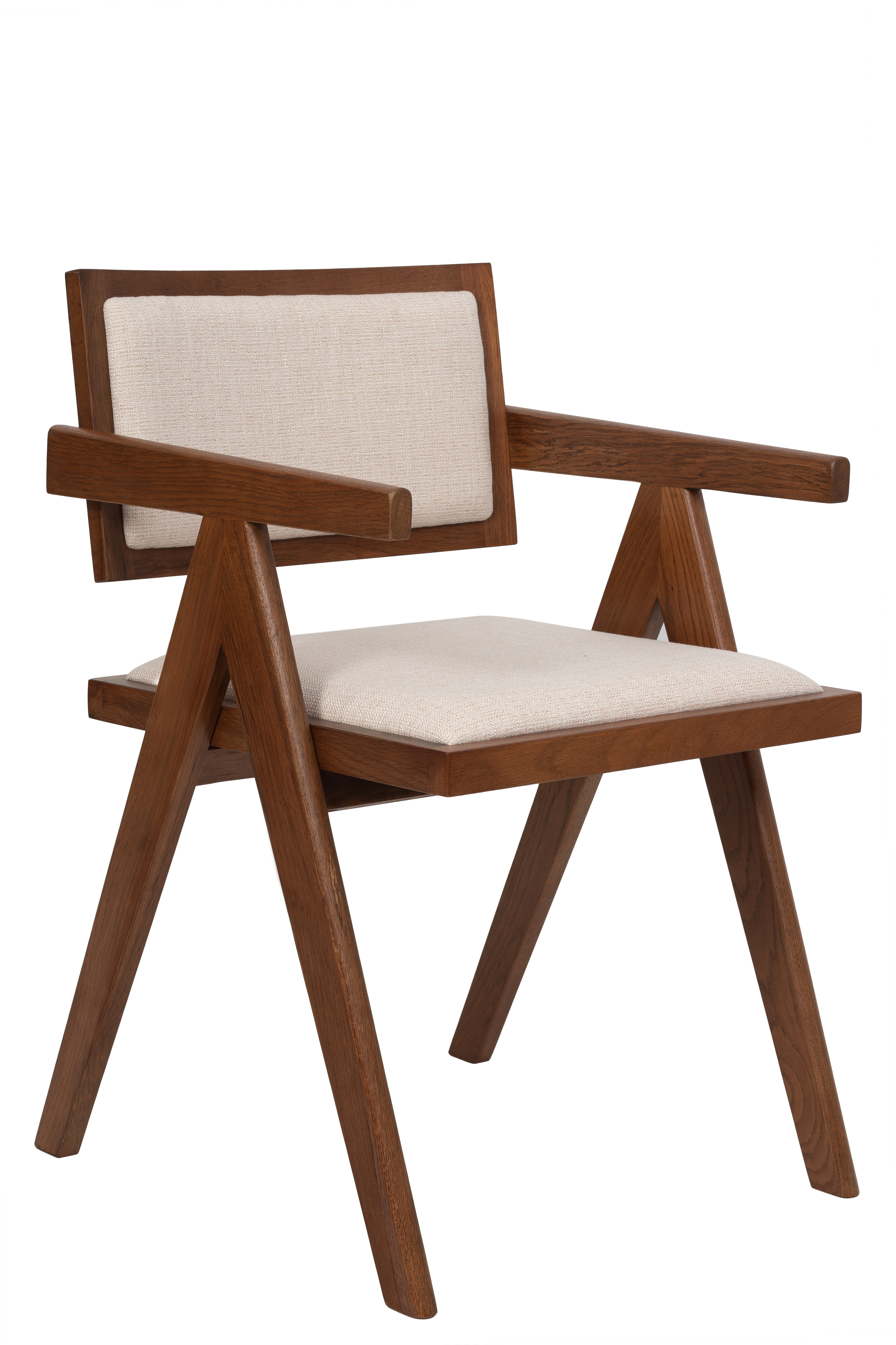 De två Sara karmstolarna kompletterar bordet med sin tidlösa design och bekväma sittkomfort. Stolarna har en stomme i FSC-certifierat massivt ekträ med valnötsfärgad yta, medan sits och rygg är klädda i ett mjukt linnefärgat tyg. Kombinationen av trä och textil ger ett harmoniskt uttryck som gör matgruppen både varm och inbjudande.