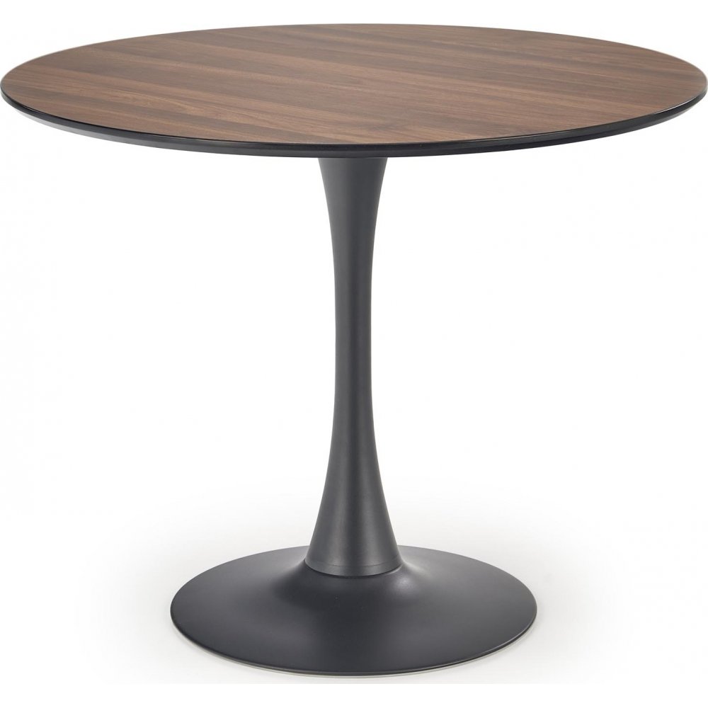 Matgruppen Olmo & Alfred kombinerar modern elegans med kompakt funktionalitet och passar perfekt i mindre matplatser eller kök. Det runda Olmo matbordet har en bordsskiva i laminerad MDF med vacker valnötsfinish och ett stabilt, svart pulverlackerat stålunderrede i pelardesign. Kombinationen av varma trätoner och svart metall ger ett tidlöst uttryck som enkelt smälter in i olika inredningsstilar.