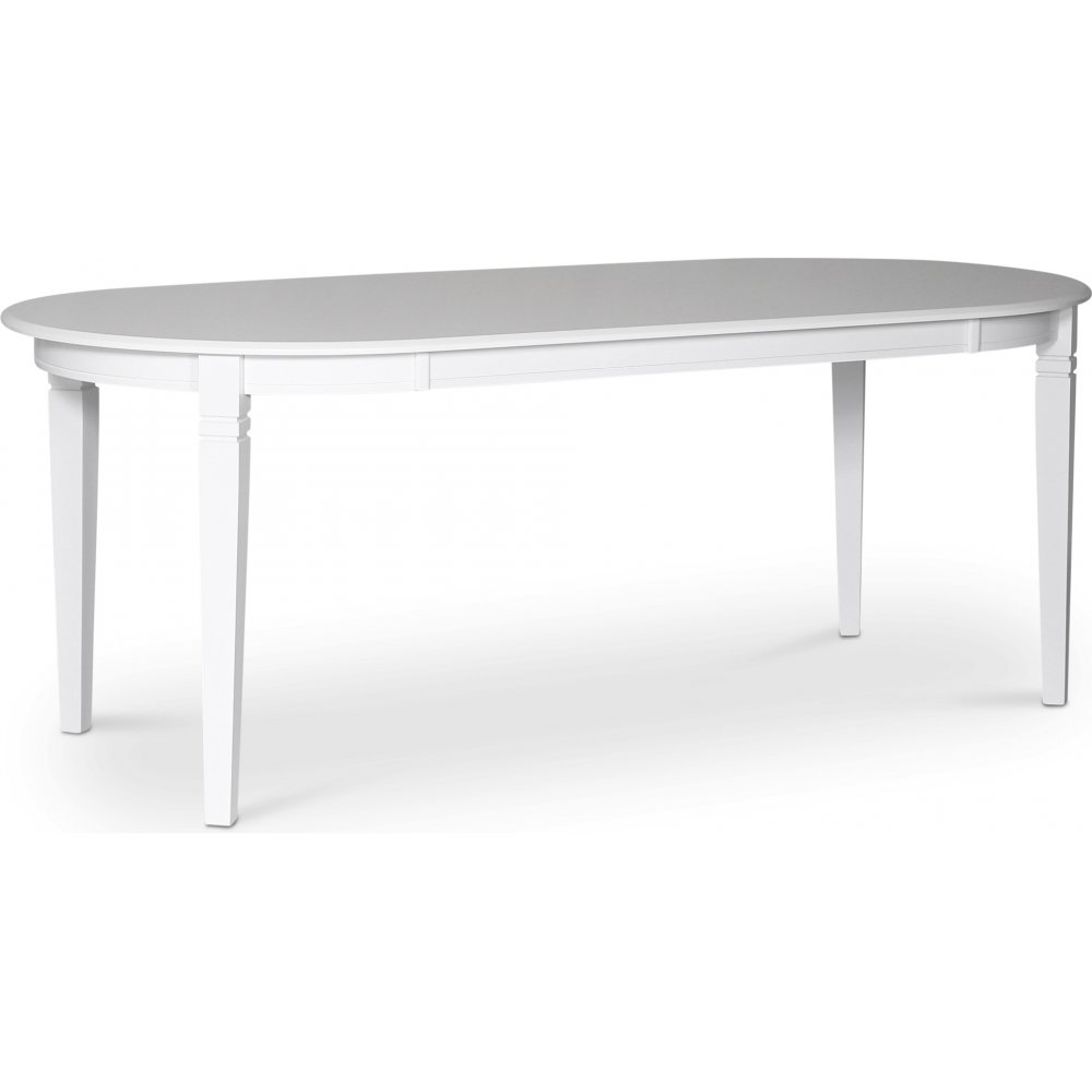 Sandhamn är en Klassisk matgrupp för praktiska behov. Ovalt bord med hela 200 cm längd och 95cm bredd för att få plats med många gäster matgrupp av hög kvalitet. Vitlackat massivt trä.