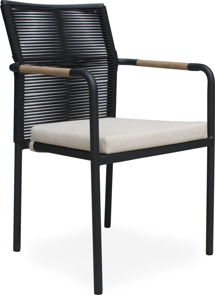 Scottsdale matgrupp för uteplatsen med ett rektangulärt robust matbord, tillsammans med Skanör karmstol med svart rygg i rep och en beige skön sittdyna. Bordet är tillverkad i svartlaserad furu vilket gör utegruppen väderbeständig och tålig för att klara uteplatsens miljö.