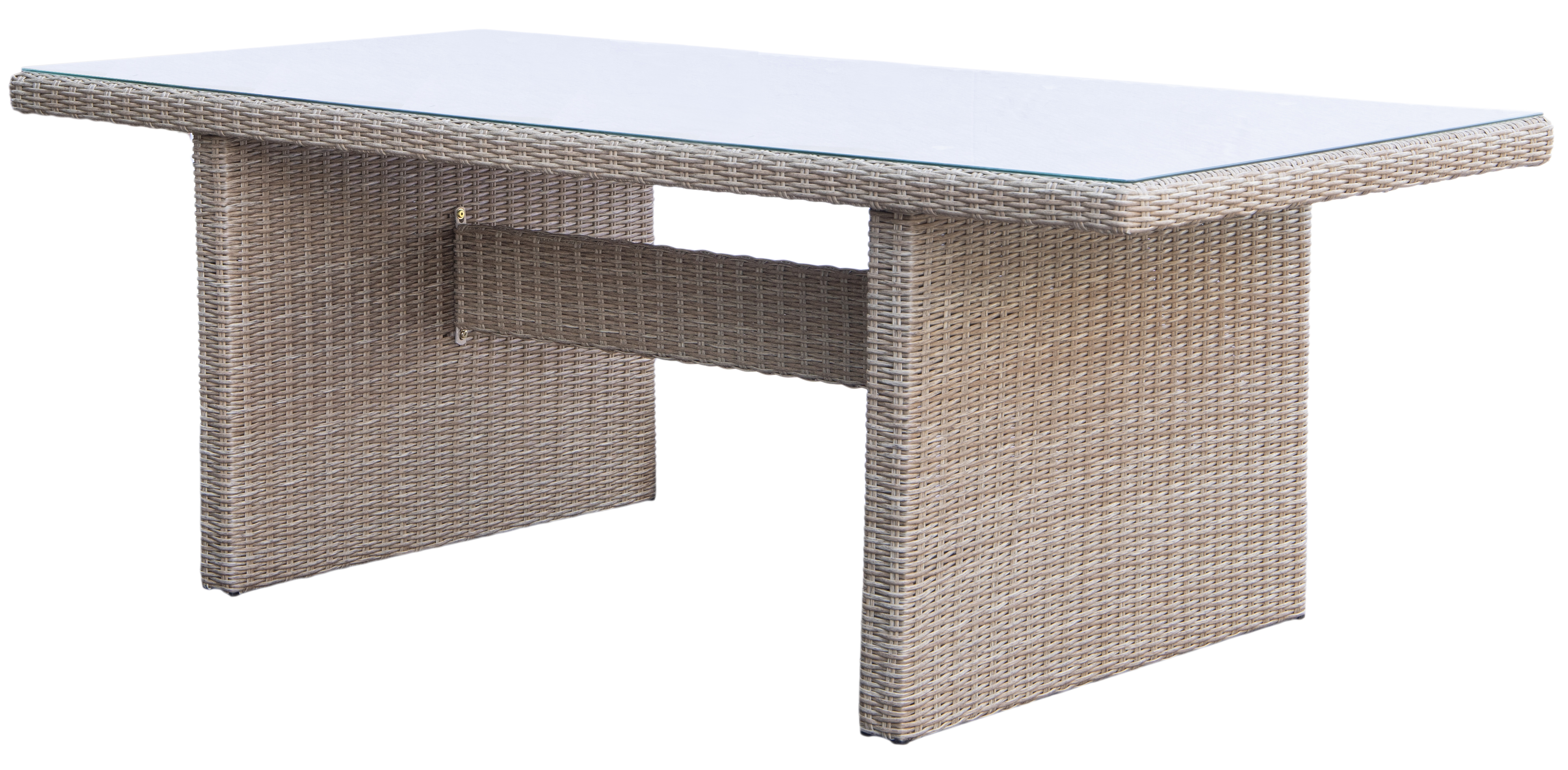 Den här matgruppen består av ett generöst matbord och sex bekväma stolar, utformade för att passa både uteplats och uterum. Bordet har en stabil stomme i aluminium klädd med naturfärgad konstrotting och en toppskiva av härdat glas som är lätt att hålla ren. Stolarna från Mercury har en halvrund konstrotting på en robust aluminiumstomme och utrustade med vita vadderade dynor som ger en skön sittkomfort under långa måltider eller avkopplande stunder.