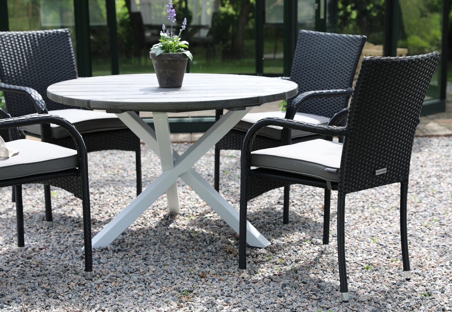 Utegrupp Aster: Scottsdale runt grå/vitt matbord Ø112 cm inklusive 4 st Aster karmstolar med sittdynor. En matgrupp i harmoni där möblerna går snyggt ihop och skapar en helhet som är svåröverträffad. Passar lika bra i uterummet som på gräsmattan.