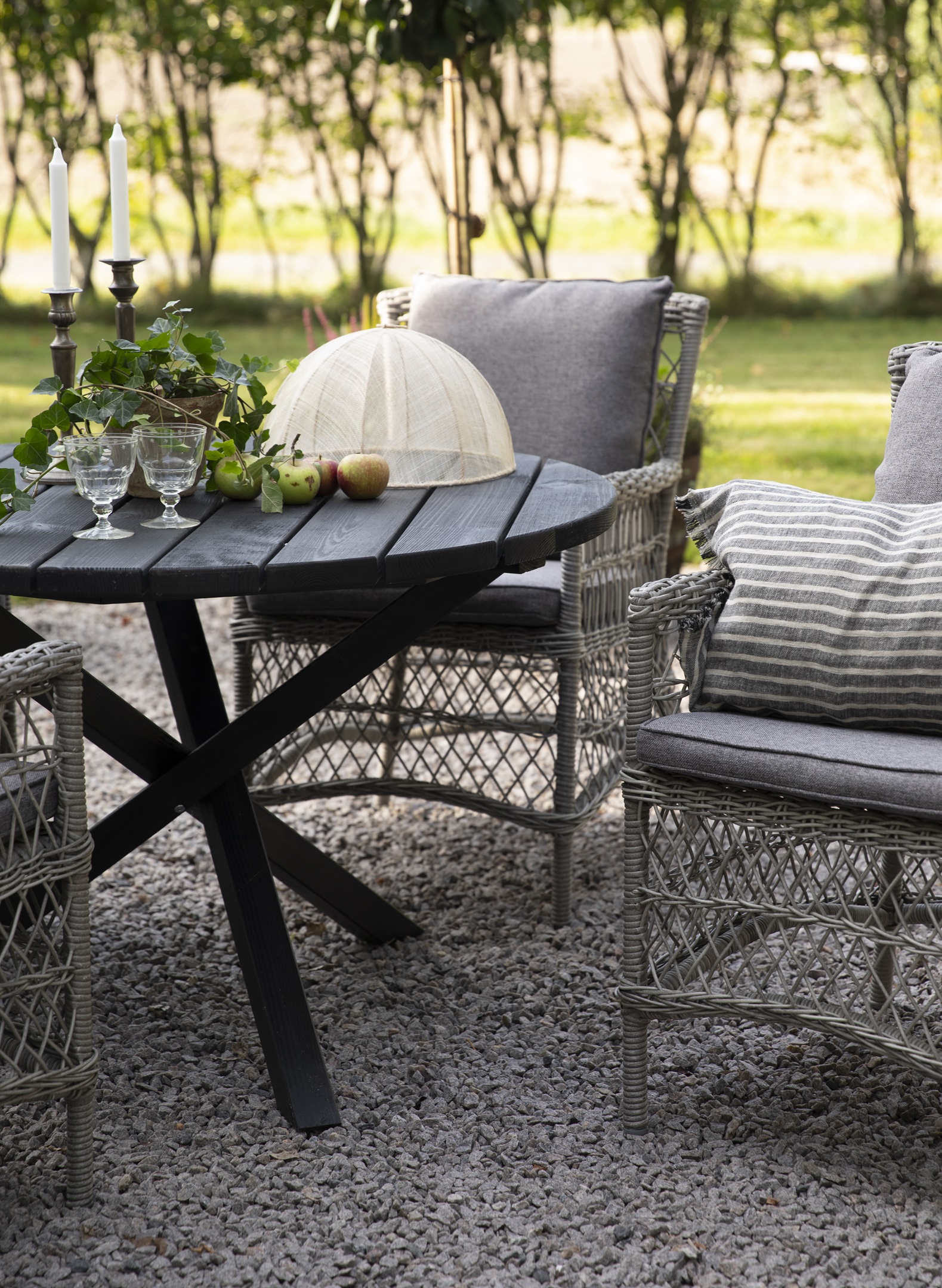 Utegrupp: svart matbord runt Ø112 cm med 4 st karmstolar
