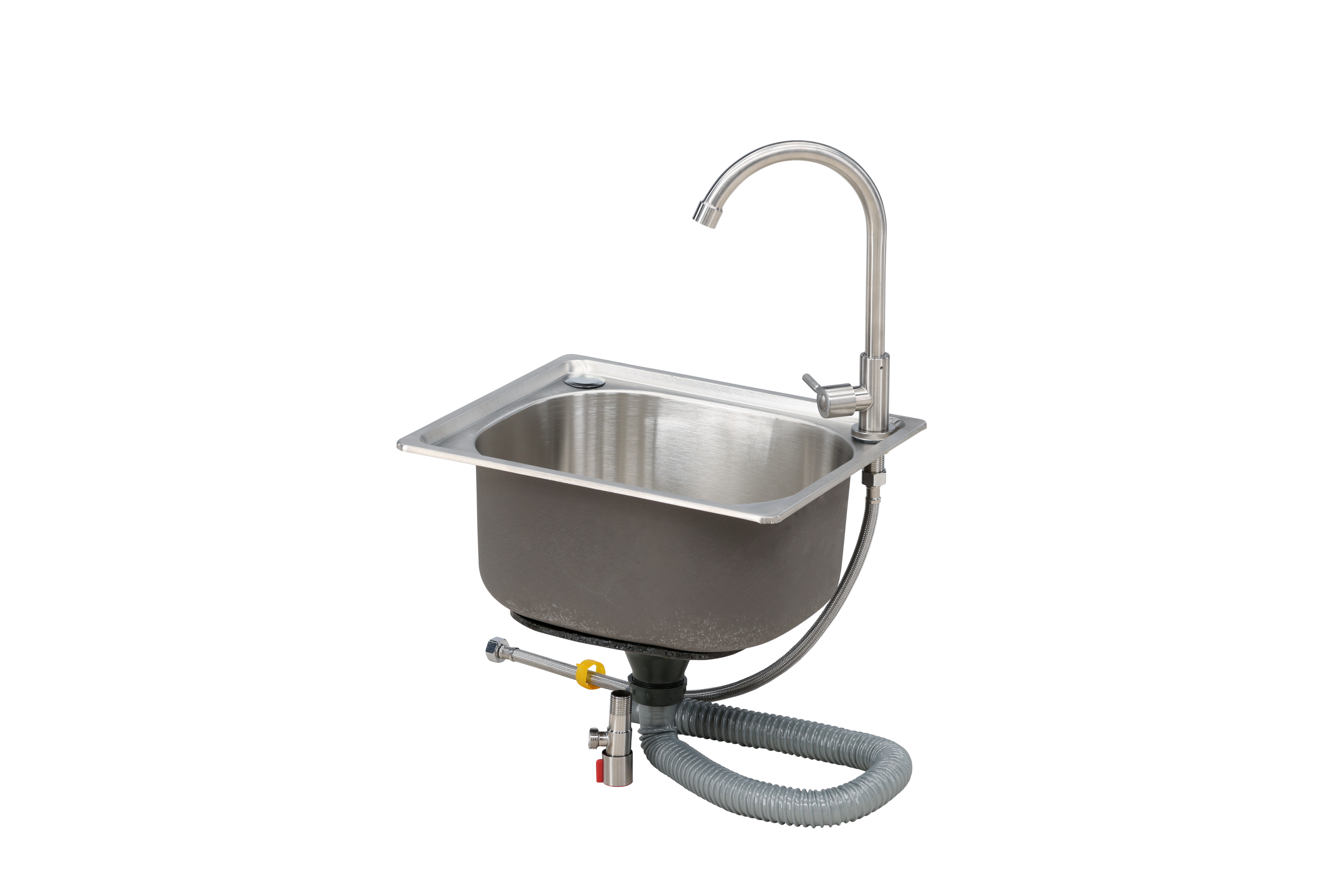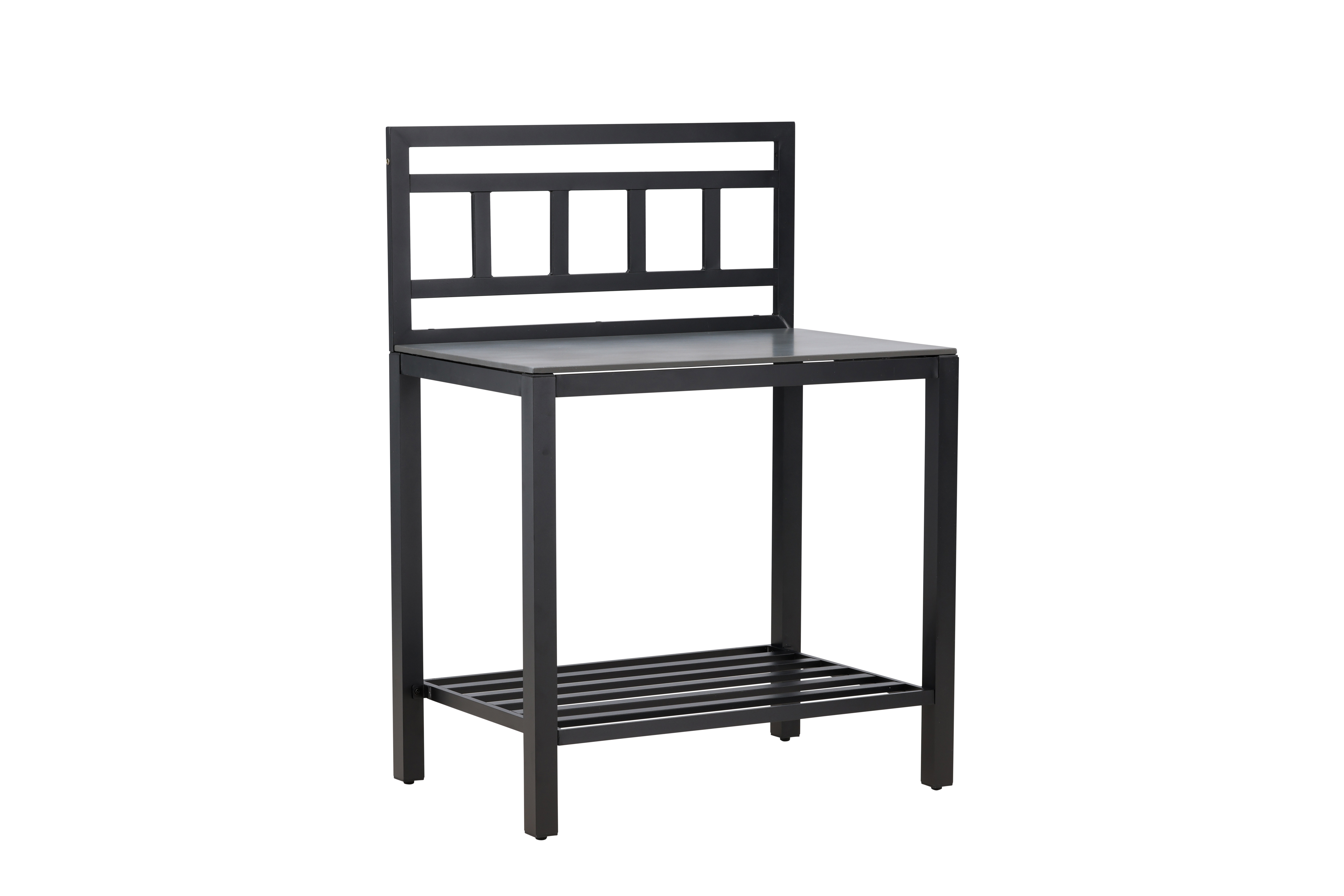 Helheten består av fem moduler: två arbetsbänkar, en bänk med förborrat hål för diskho, en hörnmodul samt en diskho i rostfritt stål med blandare och avlopp. Kombinationen skapar en generös och praktisk arbetsyta som enkelt anpassas efter plats och behov. Alla delar har en stabil stomme i svartlackerad aluminium och slitstarka skivor i grå sten, vilket ger både hållbarhet och ett stilrent uttryck.