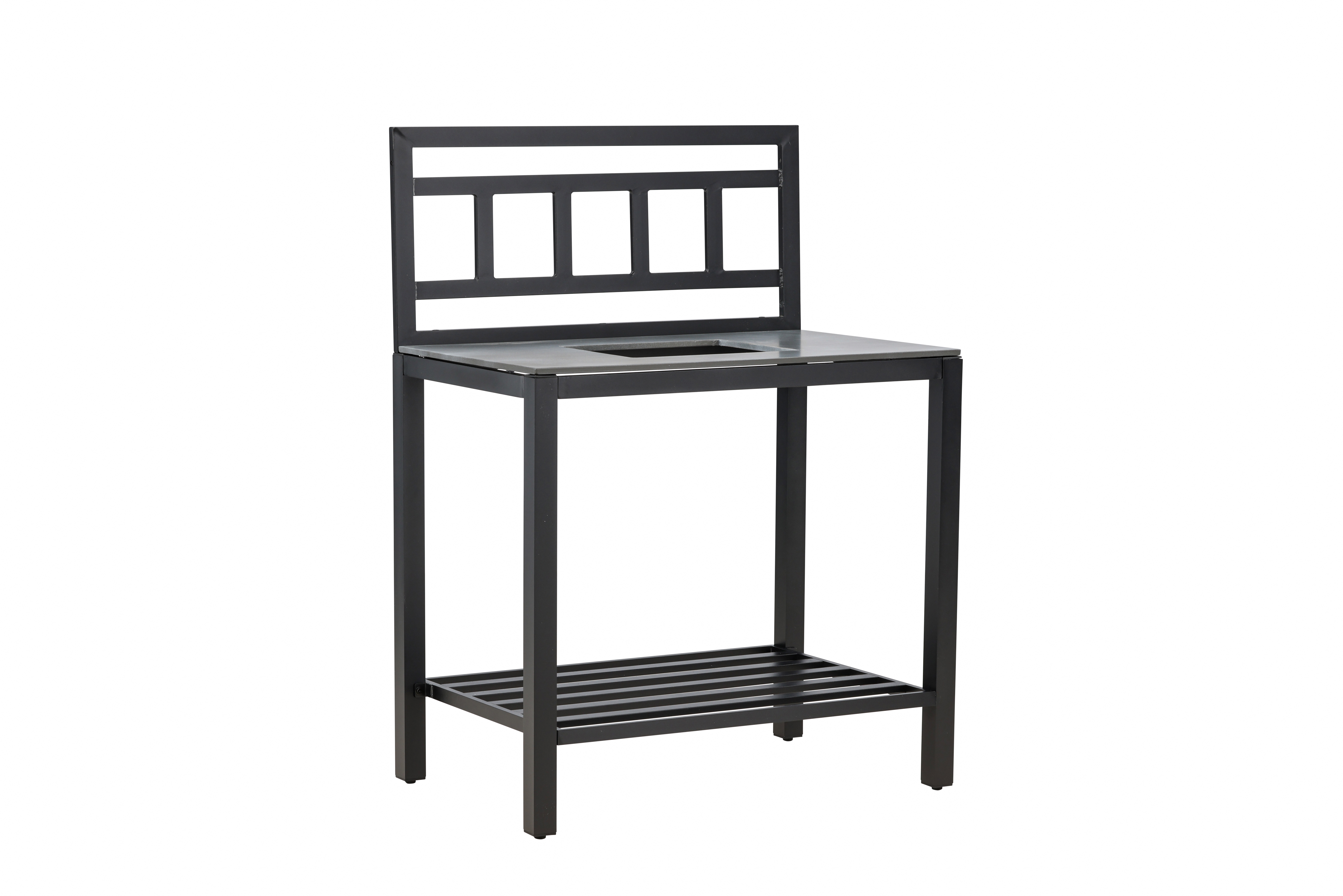 Tack vare hörnmodulen utnyttjas ytan maximalt och uteköket får en naturlig vinkel som gör arbetsflödet smidigt. Hyllplan under varje bänk ger gott om plats för redskap och tillbehör, så att allt finns nära till hands under matlagningen.