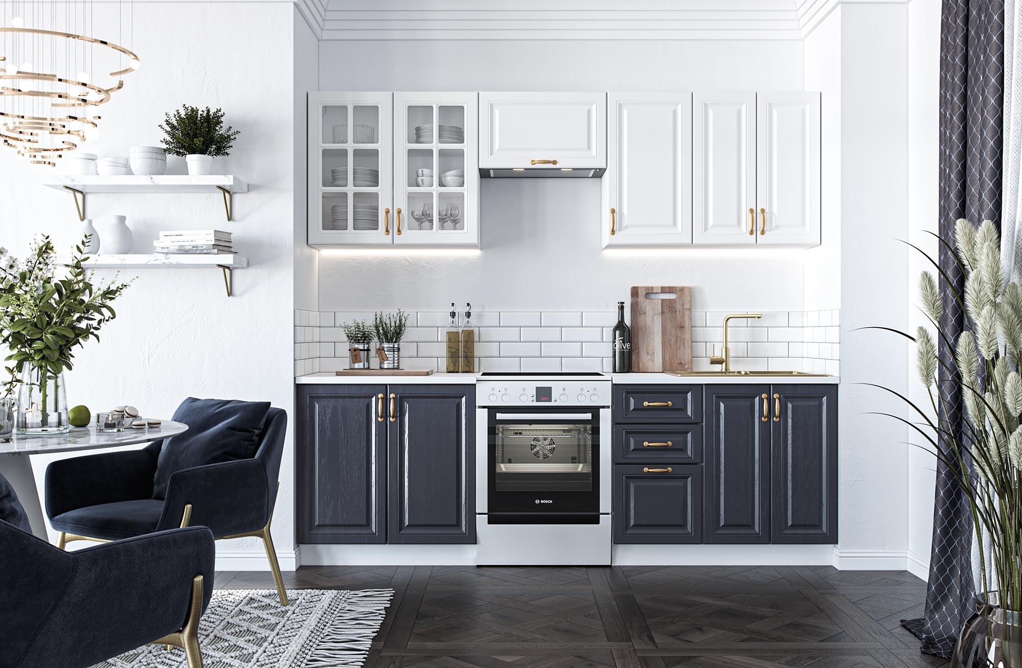 Kombinerar glamour, modern design och klassiska detaljer i en harmonisk helhet. Med en total längd på 240 cm ger detta kök gott om arbetsyta och förvaringsutrymme, perfekt för att skapa både funktionella och eleganta matlagningsmiljöer. Den stilrena kombinationen av vit och mörkblå front ger köket en lyxig och sofistikerad känsla.